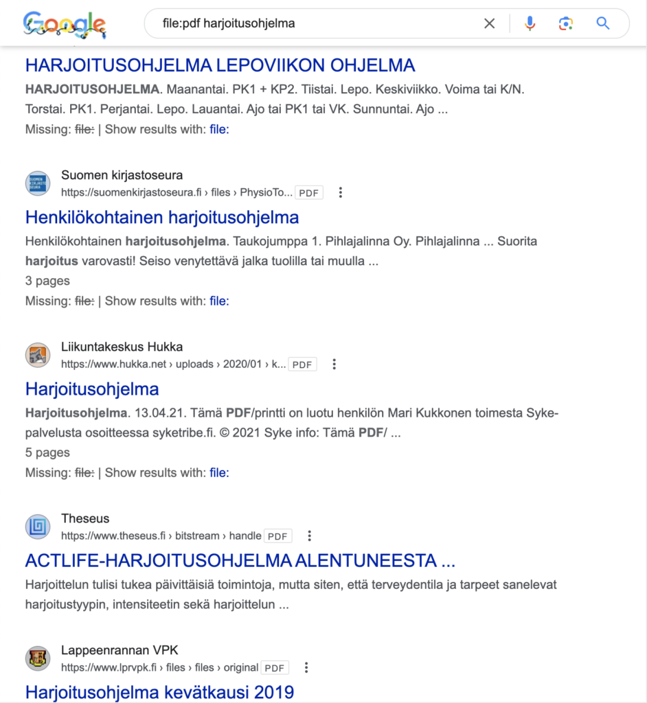 Käyttämällä file: operaattoria voit hakea vain tietyn tyypisiä tiedostoja. Esimerkissä on haettu PDF-muotoisia harjoitusohjelmia.