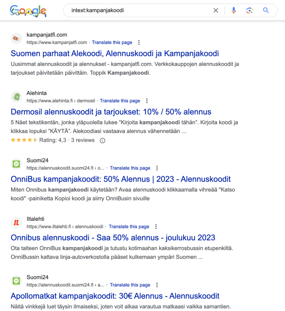 Hakusanan tulee löytyä verkkosivun tekstistä. Kätevä tapa hakea vaikka alennuskoodeja.