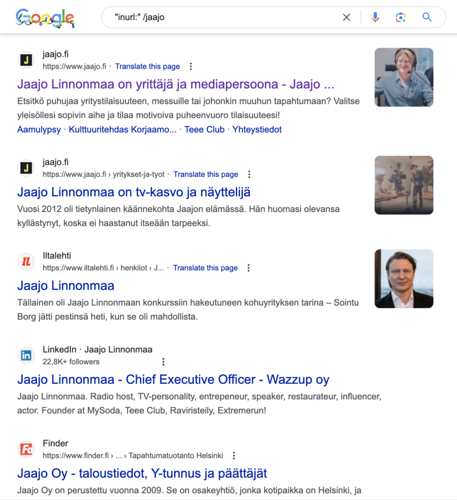 Hakuoperaattorilla määritellään, että hakusanan (merkkien) pitäis löytyä verkkotunnuksesta, eli URL: ista. Lainausmerkeillä tai ilman, tulee erilaisia tuloksia. Esimerkissä käytetty lainausmerkkejä, jotta haku tosiaan on URL: issa.