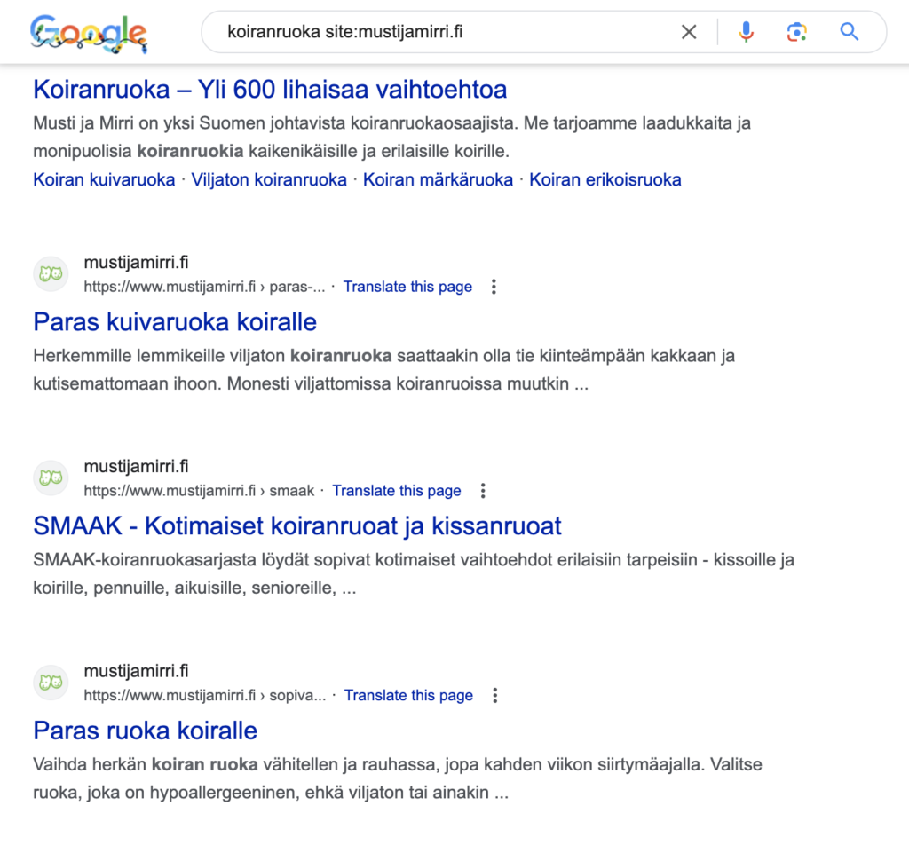 Mikäli haet esimerkiksi ”koiran ruoka”, saat kaikki sivut joissa mainitaan ”koiran ruoka”. Ohjeistamalla hakukonetta voi määrittää sen tekemään haun esimerkiksi vain tietyltä sivulta.