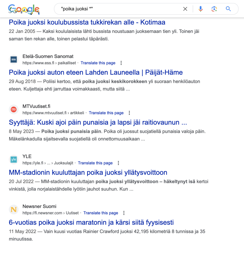 Tähti merkki eli niin sanottu wildcard kertoo, että tässä kohdassa voi olla mitä vain. Esimerkissä käytän myös lainausmerkkejä, jotta hakutulokset ovat tarkkoja.