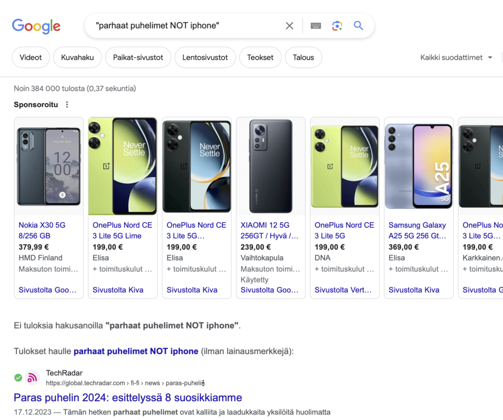 Pois sulje hakutuloksista jotkin tietyt tulokset. Esimerkissä haetaan puhelimia, mutta ei haluta iPhoneja sisältäviä tuloksia mukaan. Lainausmerkeillä saadaan taas hakutuloksiin tarkkoja vastaavuksia.