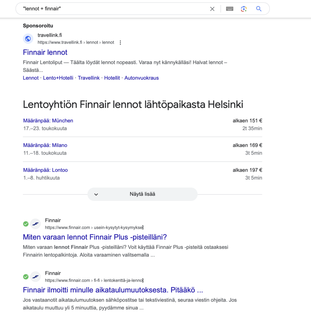 Plus-merkillä voi myös rajata tarkemmin, mistä tietoa haetaan. Kun haet esimerkiksi ”lennot + finnair” , tulee hakutuloksiin pääasissa Finnairin lentoihin liittyviä linkkejä.